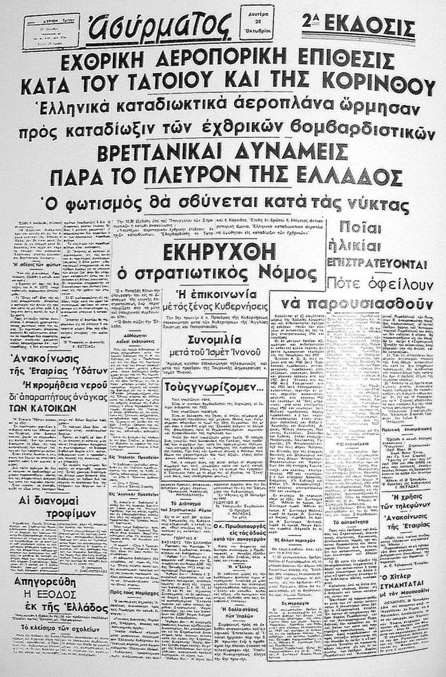 Η εφημερίδα «ΑΣΥΡΜΑΤΟΣ» στις 28 Οκτωβρίου 1940, βασικό θέμα της έχει, την έναρξη των εχθροπραξιών, το πρώτο ανακοινωθέν του Ελληνικού Επιτελείου και τους πρωινούς συναγερμούς στην Αθήνα. Άλλα θέματα, διαγγέλματα του Βασιλιά και του Πρωθυπουργού προς τον ελληνικό λαό, αλλά και ένα άρθρο με τίτλο «Η ζωή μας εις την υπερεσίαν της Πατρίδος».