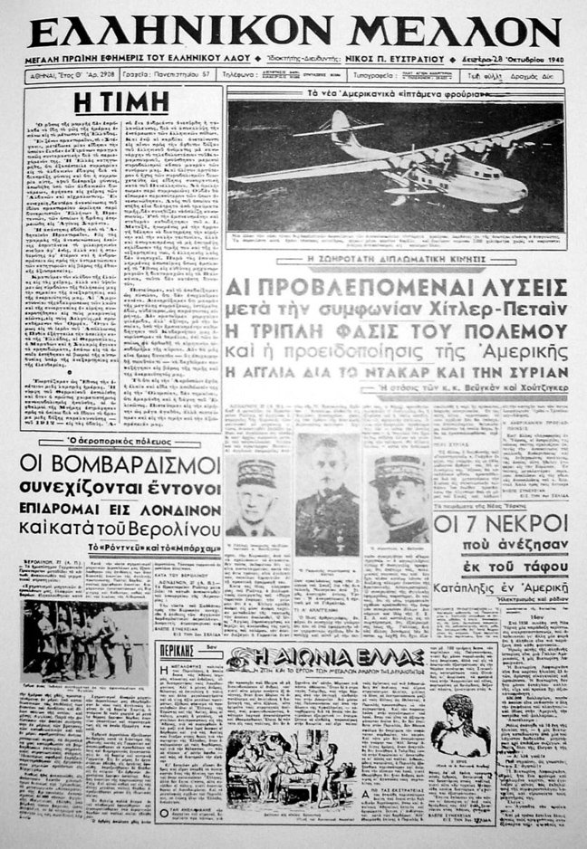 Η εφημερίδα «ΕΛΛΗΝΙΚΟΝ ΜΕΛΛΟΝ» στις 28 Οκτωβρίου 1940, βασικό θέμα της έχει τις προβλεπόμενες λύσεις μετά τη συμφωνία Χίτλερ- Πεταίν. Άλλα θέματα, η τριπλή φάση του πολέμου, οι προειδοποιήσεις της Αμερικής, η συνέχιση των βομβαρδισμών και ένα άρθρο με τίτλο «Η τιμή».