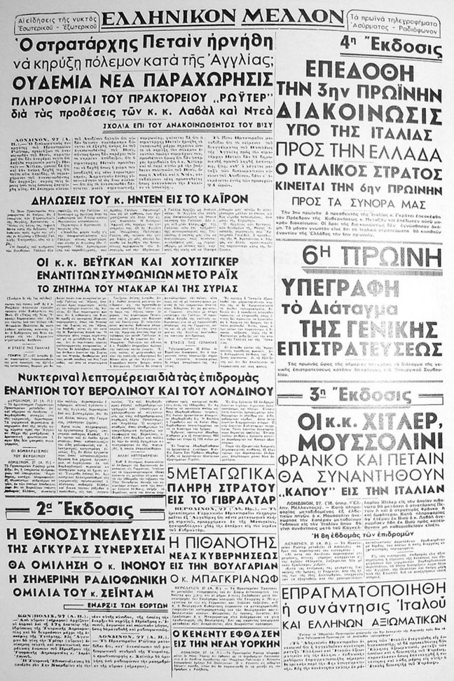 Η εφημερίδα «ΕΛΛΗΝΙΚΟΝ ΜΕΛΛΟΝ» στις 28 Οκτωβρίου 1940, σε 4η έκδοση, ανακοινώνει το τελεσίγραφο της Ιταλίας προς την Ελλάδα. Άμεση αντίδραση της Ελλάδας, η γενική επιστράτευση. Άλλα θέματα, ερώτηση αν ο στρατάρχης Πεταίν αρνήθηκε να κηρύξει πόλεμο κατά της Αγγλίας και το πρακτορείο «Ρώυτερ» αναφέρει «Ουδεμία νέα παραχώρησις».