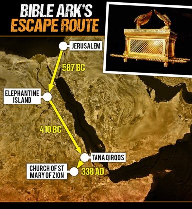 Για πολλά χρόνια, πριν καταλήξει εκεί, είχε βρει καταφύγιο, στο νησί Ελεφαντίνη της Αιγύπτου, όπου οι ερευνητές βρήκαν υπολείμματα ενός ναού ανάλογο με αυτό του Σολομώντα, ο οποίος πιθανότατα είχε φιλοξενήσει την Κιβωτό. Άγνωστο όμως το γιατί καταστράφηκε το 410 π.Χ, με αποτέλεσμα να υπάρξει νέα μετακίνηση, μέσω του ποταμού Νήλου στο νησί Τάνα Κρίκος στον ποταμό Τάνα της Αιθιοπίας και από εκεί στο σημείο που βρίσκεται σήμερα.
