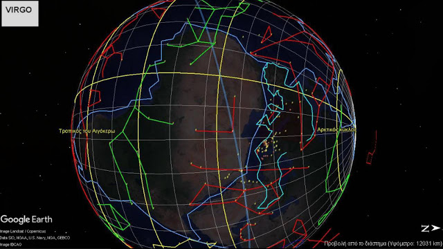 Επάνω στην γήινη επιφάνεια τοποθετούμε τις προβολές όλων των αστερισμών. Διακρίνουμε αυτούς στο κέντρο (με πράσινο), που είναι η τροχιά του ηλίου, ο ζωδιακός κύκλος. Εδώ έχουμε τους δύο οίκους, που μας ενδιαφέρουν: Τον Λέοντα και την Παρθένο στην σημερινή τους θέση. Αυτή η θέση μετατοπίζεται 1ο κάθε 72 χρόνια, λόγω της μετάπτωσης των ισημεριών. Όμως η μετατόπιση αυτή είναι σχετικά τοπική.