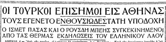 Η άφιξη του Τούρκου πρωθυπουργού στην Αθήνα και η έναρξη των Βαλκανικών αγώνων με τους πρωθυπουργούς των δυο κρατών να εισέρχονται στο Παναθηναϊκό Στάδιο χαιρετώντας τα συγκεντρωμένα πλήθη.