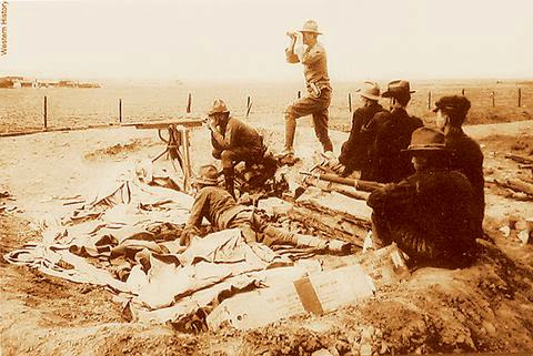 Απρίλιος 1914. Ιδιωτική φρουρά των ανθρακωρυχείων και μέλη της εθνοφυλακής έχουν τοποθετήσει τα πολυβόλα και σκοπεύουν τον καταυλισμό των απεργών