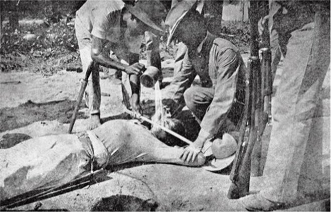 Τον έδεναν ανάσκελα και στη συνέχεια έριχναν παγωμένο ή καυτό νερό σε μια μικρή επιφάνεια του σώματός τους, με προτίμηση το κούτελό τους. Το κεφάλι ήταν το ιδανικό μέρος του ανθρώπινου σώματος εξαιτίας της ευαισθησίας του και γιατί μπορούσε να επηρεάσει σε μεγάλο βαθμό τα χαρακτηριστικά του προσώπου. Πέρα από την ανοιχτή πληγή που μπορούσε να προκαλέσει το βραστό νερό, το ψυχολογικό βασανιστήριο ήταν χειρότερο, καθώς το θύμα υπέμενε όλους τους εξευτελισμούς γυμνός μπροστά στο κοινό.