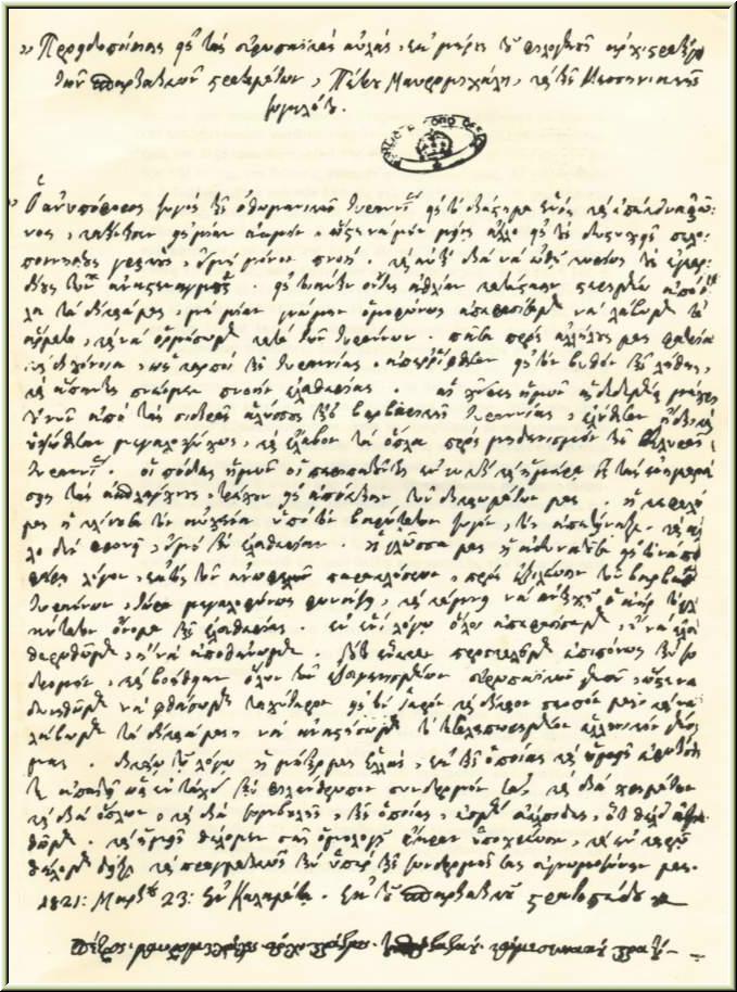 Εν ενί λόγω απεφασίσαμεν, ή να ελευθερωθώμεν, ή να αποθάνωμεν. Τούτου ένεκεν προσκαλούμεν επιπόνως την συνδρομήν και βοήθειαν όλων των εξευγενισμένων Ευρωπαίων γενών, ώστε να δυνηθώμεν να φθάσωμεν ταχύτερον εις τον Ιερόν και δίκαιον σκοπόν μας και να λάβωμεν τα δίκαιά μας.