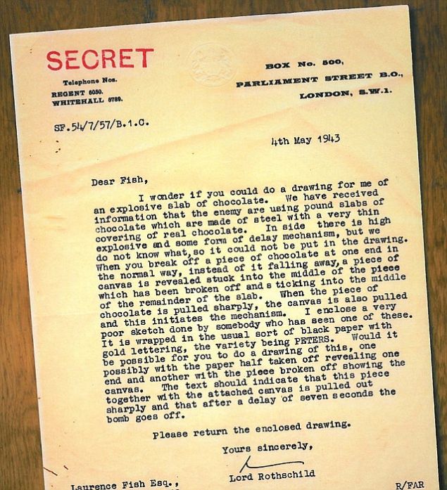 Τα πράγματα πήραν μια περίεργη τροπή το 1943 όταν ο καλλιτέχνης Λόρενς Φις έλαβε μια επιστολή με ημερομηνία 4 Μαϊου από τον Λόρδο Βίκτορ Ρότσιλντ, ανώτερο στέλεχος της βρετανικής μυστικής υπηρεσίας MI5, όπου του περιέγραφε τις λεπτομέρειες ενός πανούργου σχεδίου των Ναζί να σκοτώσουν τον Τσόρτσιλ με μία… σοκολάτα!