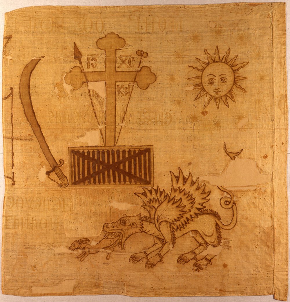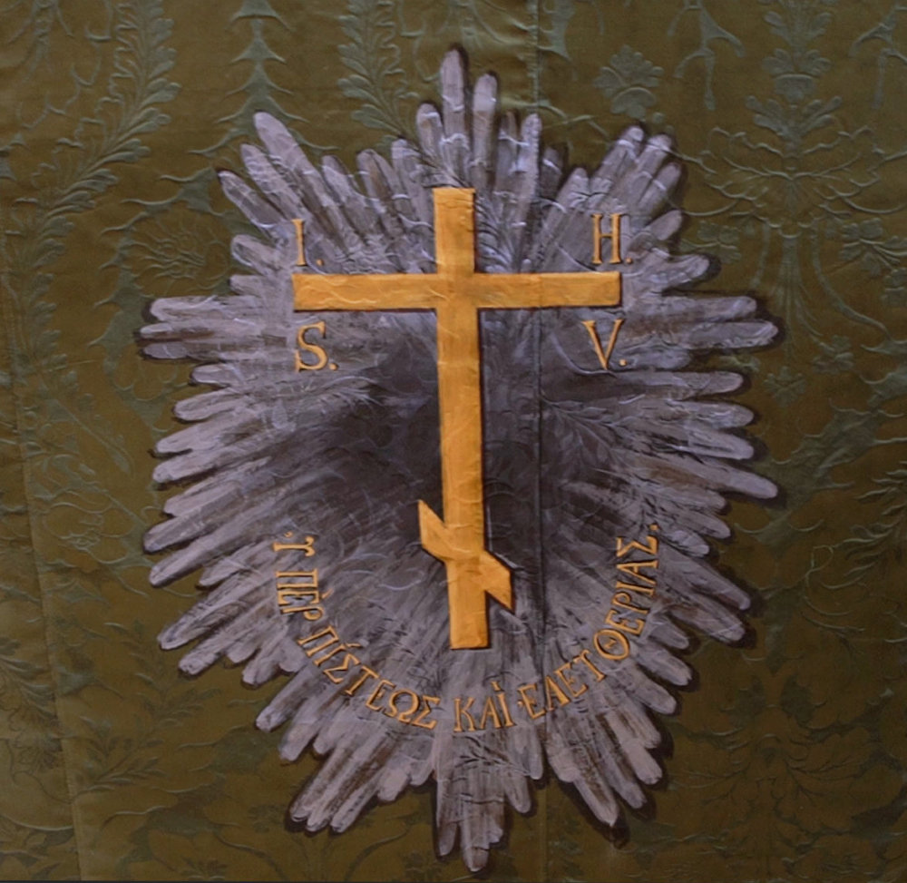 Σημαία του Αγώνα της Ανεξαρτησίας με τα σύμβολα «εφοδιαστικού ιερέως» της Φιλικής Εταιρείας