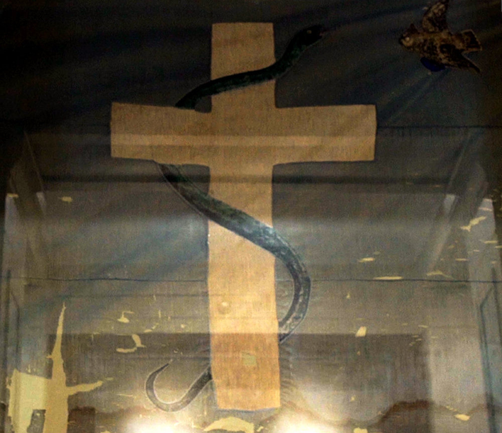 «Πρόκειται για ένα σύμβολο που επανέρχεται σε πολλές σημαίες της περιόδου και έχει μία σημασία, πρόκειται για ένα αρχαίο σύμβολο που επανέρχεται τόσους αιώνες μετά στα σύμβολα της επανάστασης. Το φίδι που περιστρέφεται και κουλουριάζεται γύρω από τον σταυρό ή από τη λόγχη. Πιθανόν να συμβολίζει τη δικαιοσύνη του αγώνα, ο τρόπος που κουλουριάζεται δηλώνει τη συνέχεια, πιθανόν τη συνέχεια του αγώνα και της προσπάθειας» σύμφωνα με την κ. Καστρίτη.