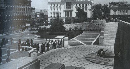 Κατάθεση στεφάνου στο μνημείο του Άγνωστου Στρατιώτη. Στο βάθος διακρίνονται τα μέγαρα Παπούδωφ και Ν. Ψύχα στην αρχή της Βασιλίσσης Σοφίας. Πηγή: Φωτογραφικό Αρχείου του Εθνικού Ιστορικού Μουσείου.
