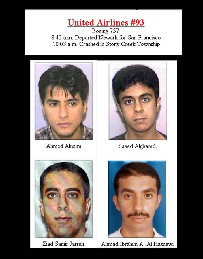Οι 4 τρομοκράτες της πτήσης 93 έκαναν περίπου τις ίδιες κινήσεις με τους άλλους. Ενώ οι μισοί έκαναν επίθεση στο πιλοτήριο οι άλλοι δυο μαχαίρωσαν τουλάχιστον έναν επιβάτη ή μέλος του πληρώματος και στην συνέχεια προχώρησαν στο βάθος.