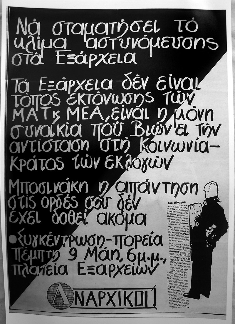 Τα ΜΑΤ και ΜΕΑ, εισβάλλουν σε καφενεία, ζαχαροπλαστεία, ταβέρνες και μπαρ της περιοχής, και προσαγάγουν όποιον θεωρούν – κρίνοντας από την εμφάνιση- ύποπτο και αναρχικό στοιχείο.
