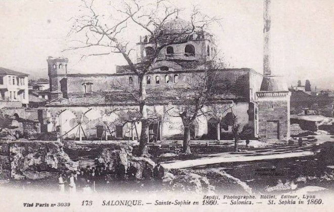 Στην σπάνια φωτογραφία από το βιβλίο του Adolf Hermann Struck, απεικονίζεται ο ναός της Αγίας Σοφίας στην Θεσσαλονίκη με άγνωστη ημερομηνία. Η αντίστοιχη καρτ ποστάλ είχε τυπωμένη ως χρονολογία το 1860, αλλά ιστορικοί και συλλέκτες το αμφισβητούν ορίζοντας ως πιθανή ημερομηνία το 1890, δηλαδή λίγο πριν παραδοθεί στις φλόγες.