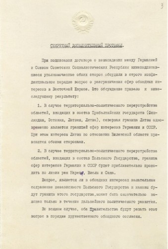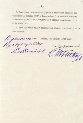 Οι υπογραφές στο Σύμφωνο μπαίνουν σε σύσκεψη στη Μόσχα, με κάθε επισημότητα, και παρουσία διεθνών ΜΜΕ. Και οι δυο πλευρές, ωστόσο, υπογράφουν ένα ακόμα, μυστικό αυτή τη φορά, σύμφωνο, με το οποίο μοιράζουν τη βορειοανατολική Ευρώπη σε «σφαίρες συμφερόντων», παραχωρώντας στο καθεστώς του Ιωσήφ Στάλιν τις τρεις βαλτικές χώρες και τη Φινλανδία.