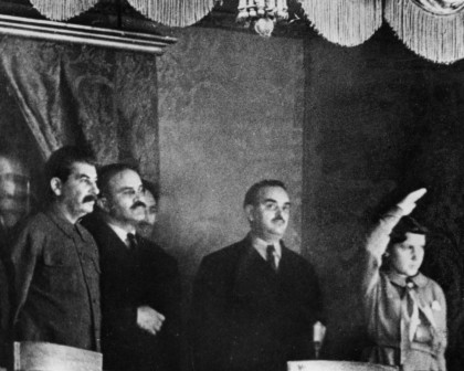 Από αριστερά, ο Στάλιν, συνοδευόμενος από τον πρωθυπουργό Vyacheslav Molotov, τον Nikolai Shvernik, και την νεαρή κόρη του Svetlana το 1937