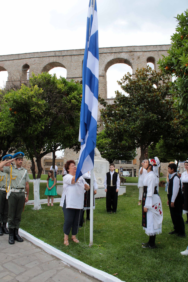 Η δήμαρχος Δήμητρα Τσανάκα ύψωσε τη σημεία στον ιστό έναντι του μεσαιωνικού υδραγωγείου-Καμάρες όπου βρισκόταν το πρώτο διοικητήριο της ελεύθερης Καβάλας