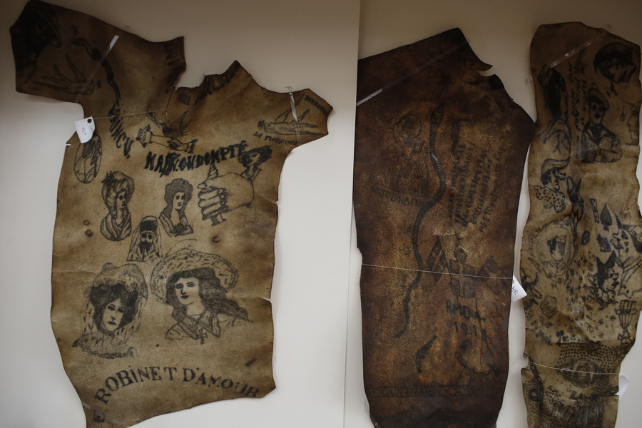 Και η λίστα με τα αντικείμενα που εκτίθενται στο μουσείο Εγκληματολογίας δεν σταματά εδώ. Απέναντι από τα κέρινα ομοιώματα βρίσκονται τα δέρματα με τα τατουάζ. Πρόκειται για δέρματα ανθρώπων που όταν πέθαιναν τους αφαιρούσαν. «Αυτό γινόταν μέχρι τη δεκαετία του 1950, μετά απαγορεύτηκε. Έβγαζαν το δέρμα στον αέρα και το στέγνωναν. Για να έχει κάποιος τατουάζ εκείνη τη δεκαετία έπρεπε να είναι, ή κακοποιός ή φυλακισμένος ή ναυτικός», λέει στο ΑΠΕ-ΜΠΕ η κ. Στεφανίδου- Λουτσίδου. Σε κάποια δεσπόζουν γυναικείες μορφές, σε κάποια άλλα εθνικά σύμβολα, ονόματα γυναικών και φράσεις στα γαλλικά.