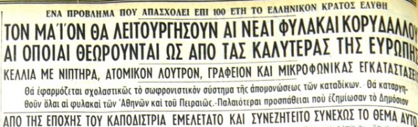 1961. Πρώτο θέμα στις εφημερίδες είναι η λειτουργία των νέων φυλακών, που κατασκευάζονταν στην αραιοκατοικημένη περιοχή του Κορυδαλλού. «Ένα βασικόν κοινωνικόν πρόβλημα που απασχολεί το Ελληνικόν Κράτος επί εκατό και πλέον έτη λύεται επιτέλους με τον καλύτερον δυνατόν τρόπον», έγραφαν οι εφημερίδες.