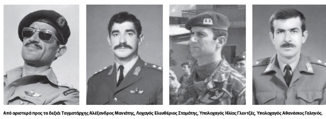 Πάνω: Ταγματάρχης Αλέξανδρος Μανιάτης, Λοχαγός Ελευθέριος Σταμάτης, Υπολοχαγός Ηλίας Γλεντζές, Υπολοχαγός Αθανάσιος Γαληνός