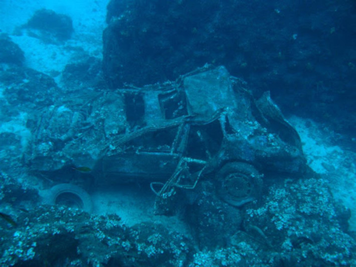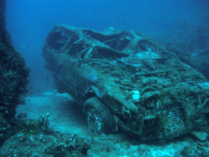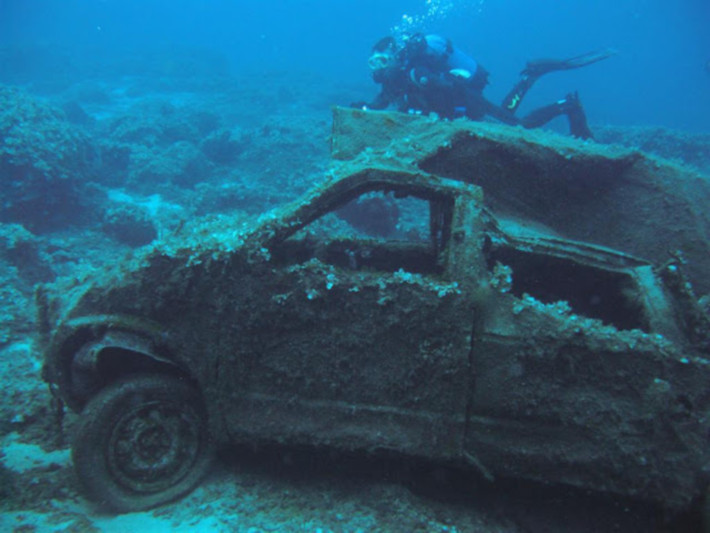 Δεκάδες κουφάρια αυτοκινήτων έχουν γίνει ένα με το βυθό, δημιουργώντας μια παράταιρη εικόνα. Σκόρπια ανταλλακτικά και λάστιχα έχουν γίνει τμήμα της υποβρύχιας φύσης. Το απόκοσμο, σχεδόν μακάβριο, σκηνικό αποτελεί attraction για φτασμένους και επίδοξους βατραχανθρώπους. Γιατί μακάβριο; Διότι το φαινόμενο δεν έχει εξηγηθεί ακόμα επαρκώς. Τη λύση στο πέπλο μυστηρίου που το καλύπτει γνωρίζουν μόνο τα… πλάσματα του βυθού, που βρίσκουν καταφύγιο στις «άψυχες» λαμαρίνες.
