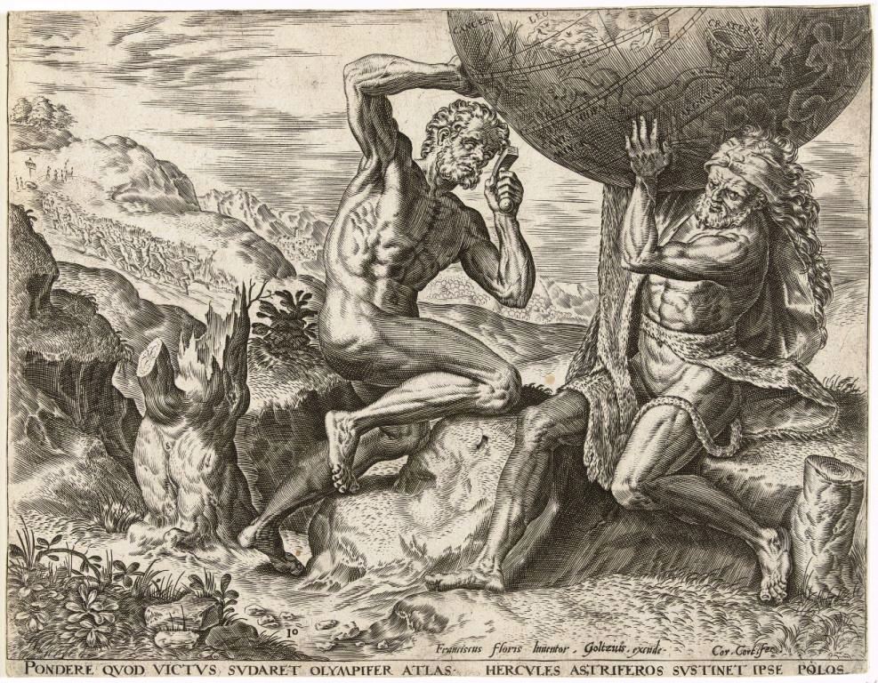 Αρνήθηκε να κρατήσει τον ουρανό, με τη δικαιολογία ότι θα πήγαινε ο ίδιος τα φρούτα στον Ευρυσθέα. Ο Ηρακλής, όντας οξυδερκής, κατάλαβε το τέχνασμα του. Προσποιούμενος ότι χρειάζεται λίγη βοήθεια για να κρατάει το θόλο καλύτερα, άφησε όλο το βάρος να πέσει στην ωμοπλάτη του Άτλαντα και έτσι συνεχίστηκε η αιώνια τιμωρία του. Από αυτό το αιώνιο βασανιστήριο προκύπτει και το όνομα «Άτλας» – προέρχεται από το γράμμα άλφα και τη λέξη «τλαν», που σημαίνει «εκείνος που υπομένει τα πάντα»….