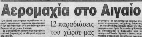Την επόμενη βδομάδα ο πιλότος Μ.Σ. και ο εκπαιδευτής του Γ.Π. είχαν εμπλακεί σε μία από τις πολλές αερομαχίες στο Αιγαίο, η οποία κράτησε πολλή ώρα. Μαχητικά των δύο χωρών συναντήθηκαν στην εναέρια περιοχή της Χίου και των Οινουσσών.