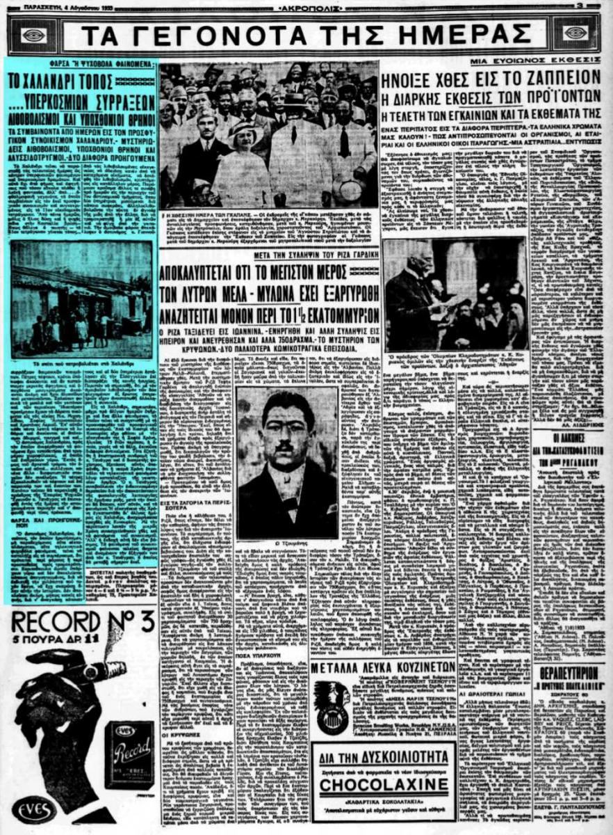 Tο καλοκαίρι του 1933, το Χαλάνδρι είχε μετατραπεί σε κέντρο υπερφυσικών φαινομένων και υπερκόσμιων δραμάτων. Και αυτό επιβεβαιωνόταν, όχι από φήμες και αφηγήσεις, που τόσο εύκολα έπλαθε η λαϊκή φαντασία, αλλά από οφθαλμοφανή γεγονότα, τα οποία συνέβαιναν στον εκεί προσφυγικό συνοικισμό και συγκεκριμένα, στο 11ο οικοδομικό τετράγωνο.