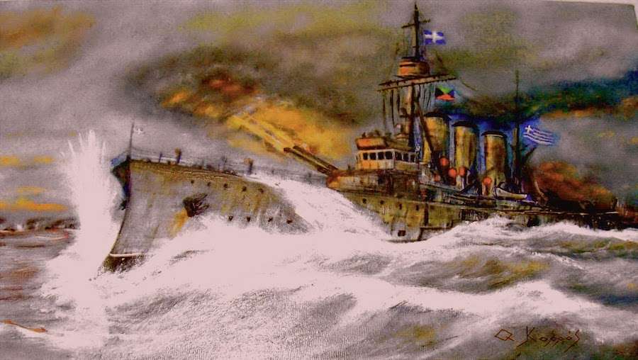 Ο ελληνικός στόλος με επικεφαλής την ναυαρχίδα θωρηκτό Αβέρωφ, ακολουθούμενη από τα θωρηκτά Ύδρα, Σπέτσες, αρχηγίδα του Μοιράρχου Πλοιάρχου Πέτρου Γκίνη και Ψαρά, και από πίσω τα αντιτορπιλλικά Αετός, Ιέραξ, Λέων και Πάνθηρ (τα αποκαλούμενα Θηρία) έσπευσε να συναντήσει τον αντίπαλο στόλο.