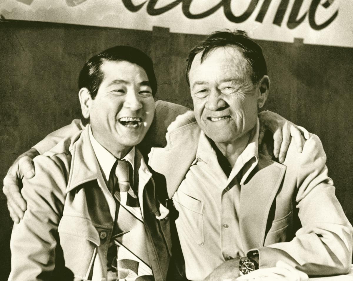 Ο Boyington (δεξιά) με τον Kawato Masajiro το1977. Ο Kawato ήταν Ιάπωνας πιλότος που είχε βρεθεί αντιμέτωπος με τον Boyington στην αερομαχία της 3ης Ιανουαρίου.