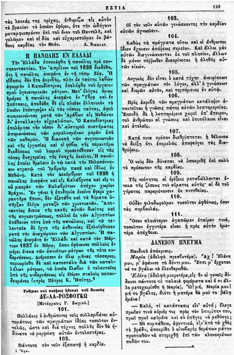 Μία ἐπίσης πολὺ σημαντικὴ πηγὴ ἀποτελεῖ τὸ δημοσίευμα (2) τῆς ἐφημερίδας «ΕΣΤΙΑ» στὶς 11/03/1879, τὸ ὁποῖο αναφέρεται στὶς λοιμικὲς νόσους τῶν περιόδων 1828 καὶ 1837.