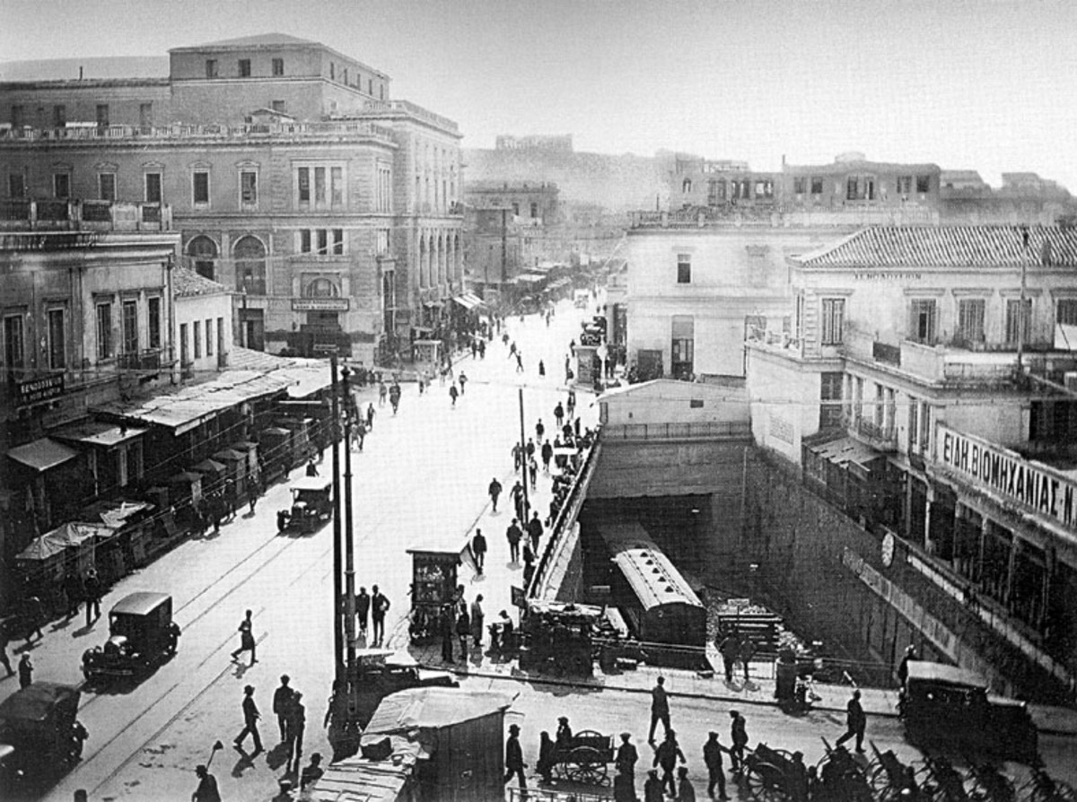 Η είσοδος του σταθμού ηλεκτρικού σιδηροδρόμου στην Ομόνοια στη δεκαετία του ‘30. Στο βάθος διακρίνεται η οδός Πανεπιστημίου και τα ξενοδοχεία «Excelsior» και «Plaza» στις δύο πλευρές του δρόμου.