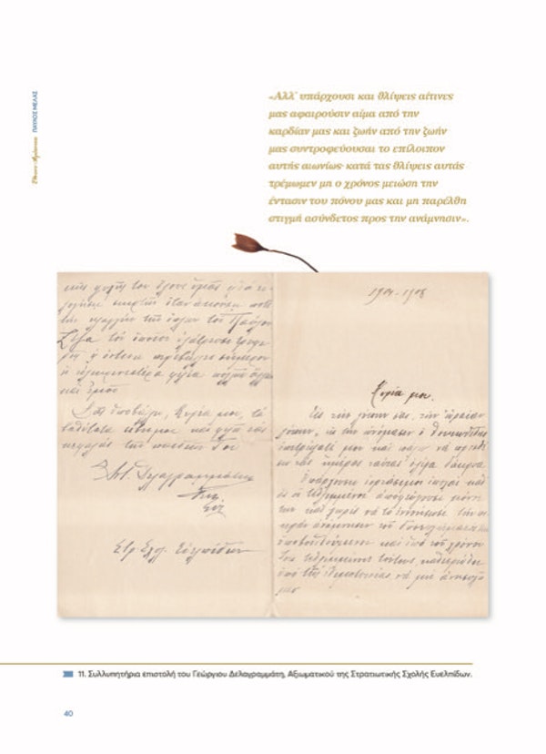 «Αλλ’ υπάρχουσι και θλίψεις αίτινες μας αφαιρούσιν αίμαν από την καρδίαν μας και ζωήν από τη ζωήν μας μας συντροφεύουσαι το επίλοιπον αυτής…», γράφει στην επιστολή του ο αξιωματικός της Σχολής Ευελπίδων, Γιώργος Δελαγραμμάτης.