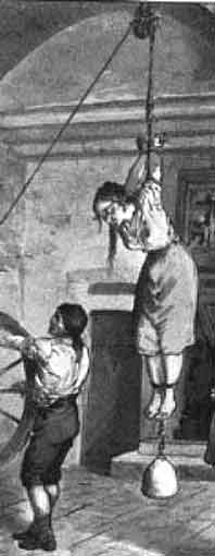Τα χέρια του ανακρινόμενου δένονταν πίσω απ’ την πλάτη του και συνδέονταν με ένα σχοινί το οποίο κρεμόταν απ’ τον τοίχο. Στη συνέχεια, τον σήκωναν στον αέρα και στηριζόταν μόνο από τα χέρια. Ο πόνος στους ώμους και στα χέρια ήταν εξασφαλισμένος και αφόρητος. Πολλές φορές, μάλιστα, άφηναν το σχοινί ελεύθερο και το σταματούσαν απότομα, για να εξαρθρώσουν τους ώμους του κατηγορούμενου και να εντείνουν το βασανιστήριο.