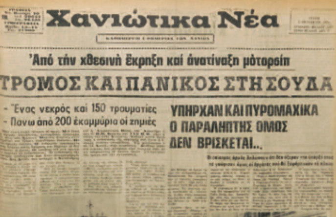 «Ώρα εννιά παρά τέταρτο το πρωί. Μια έκρηξη ισχυρή, ασυνήθιστη, συνταράσσει ολόκληρη την πόλη των Χανίων. Καταστήματα, σπίτια αυτοκίνητα, ηλεκτρικά και τηλεπικοινωνιακά δίκτυα έχουν καταστραφεί σε ποσοστό 50% μέχρι 100%», ανέφεραν την επομένη στο πρωτοσέλιδό τους τα «Χανιώτικα Νέα», καθώς η Σούδα έμοιαζε με βομβαρδισμένο τοπίο. Ανυπολόγιστες ήταν οι υλικές ζημιές, ενώ η περιοχή κηρύχτηκε σε κατάσταση έκτακτης ανάγκης και γέμισε από γιατρούς, νοσηλευτικό προσωπικό και εθελοντές, που έσπευσαν να δώσουν αίμα για τους τραυματίες.