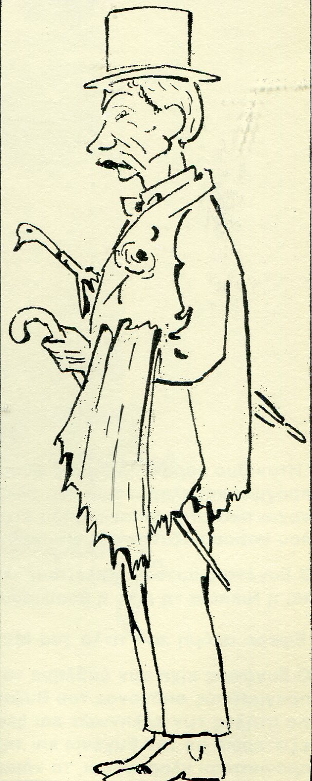 Φορά ρεντιγκότα, ριγωτό παντελόνι, λουστρίνια παπούτσια, χρυσή αλυσίδα ρολογιού, ψηλό καπέλο και πολύχρωμο σάλι στους ώμους, ενώ κρατά κι ένα κομψό μπαστούνι. Την επιβλητική εικόνα του ενισχύει το ψηλόλιγνο σώμα, το χοντρό μουστάκι και τα γαλανά του μάτια, ενώ περπατά πάντα σοβαρός και αμίλητος εντυπωσιάζοντας τους Αθηναίους με το διπλό του πρόσωπο: πλανόδιος πωλητής τις καθημερινές, αριστοκράτης και θαμώνας των καλυτέρων μαγαζιών τις Κυριακές.