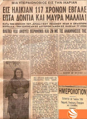 Στο σχετικό δημοσίευμα του 1954 που θα δείτε παρακάτω και που φέρνει στο φως το Ikariamag ο δισέγγονος της υπεραιωνόβιας, Σταύρος Μαρτίνης ομολογεί πως η γυναίκα μετά τα 100 ξεκίνησε να βγάζει πάλι μαύρες τρίχες και 7 δόντια!