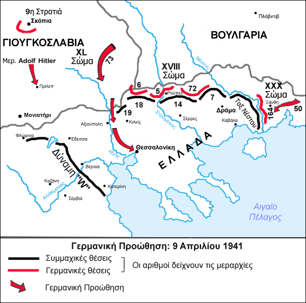 Η επίθεση της Γερμανίας κατά της χώρας μας εκδηλώθηκε στις 5:15 το πρωί της 6ης Απριλίου 1941 στα οχυρά της Θράκης και της Ανατολικής Μακεδονίας, 45 λεπτά πριν από την προβλεπόμενη ώρα, σύμφωνα με τη γερμανική διακοίνωση που είχε επιδοθεί νωρίτερα στον πρωθυπουργό Αλέξανδρο Κορυζή από τον γερμανό πρεσβευτή στην Αθήνα, πρίγκιπα Έρμπαχ.