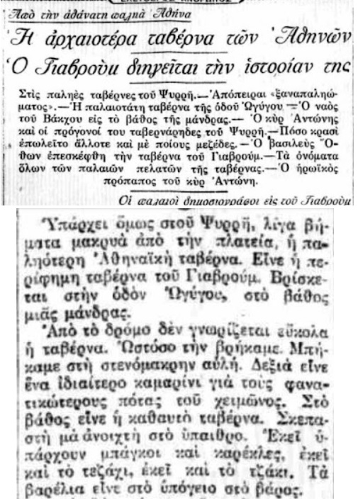 Η πιο παλιά ταβέρνα βρισκόταν στου Ψυρρή και ήταν η ταβέρνα ενός άντρα που λεγόταν Αντώνης ή για τους πολλούς, Γιαβρούμ.