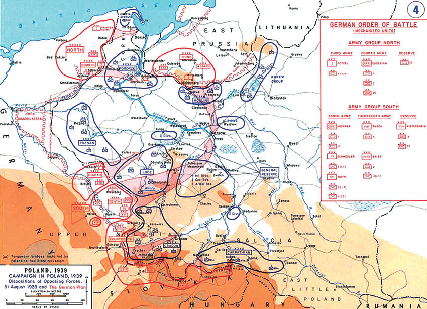 Οι γερμανικές στρατιές επιτέθηκαν ταυτόχρονα σχεδόν κατά των Πολωνών σε όλο το μήκος των συνόρων. Ο πολωνικός Στρατός κατόρθωσε να κρατήσει μόνο για δύο ημέρες. Στις 3 Σεπτεμβρίου, την ημέρα που οι Δυτικοί κήρυξαν τον πόλεμο στη Γερμανία, ο Κλούγκε είχε διαλύσει τις πολωνικές δυνάμεις στον διάδρομο του Ντάντσιχ, ο Κούχλερ προήλαυνε σταθερά από την Αν. Πρωσία, ο Ράιχεναου είχε συντρίψει τους συνδέσμους μεταξύ των πολωνικών στρατιών του Λοτζ και της Ποζνανίας, τις είχε υπερκεράσει και εκινείτο σε βάθος 80 χλμ. πίσω τους!