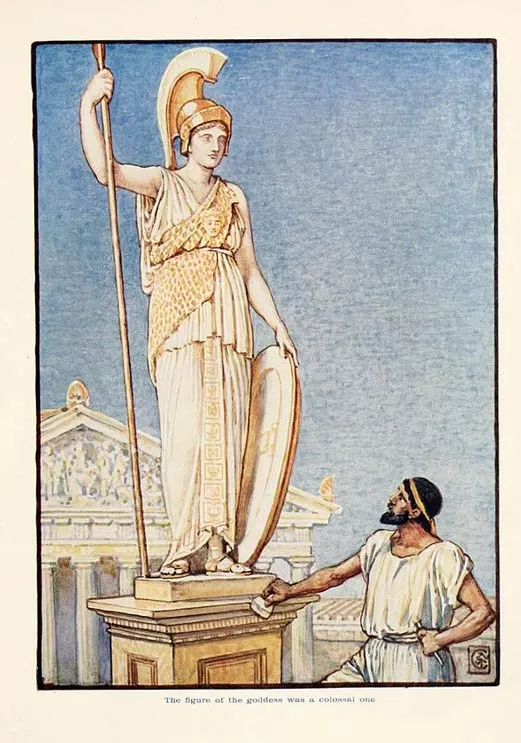 Η τεράστια ποσότητα χρυσού έδωσε αφορμή στους εχθρούς του Φειδία να τον κατηγορήσουν για κατάχρηση. Ο Φειδίας απέδειξε την αθωότητά του, επειδή ο Περικλής τον είχε συμβουλέψει να κάνει το χρυσό ένδυμα της Αθηνάς συναρμολογούμενο. Έτσι μπόρεσε να το αποσυναρμολογήσει και να το ζυγίσει. Το βάρος του χρυσού βρέθηκε ακέραιο κι έτσι ο Φειδίας αθωώθηκε. Όμως κατόπιν κατηγορήθηκε για αλαζονεία επειδή στην εξωτερική όψη της ασπίδας της Αθηνάς, που έφερε ανάγλυφη Αμαζονομαχία, παρέστησε σε δύο Αθηναίους πολεμιστές το πορτρέτο του Περικλή και το δικό του. Ο Φειδίας συνελήφθη και καταδικάστηκε.