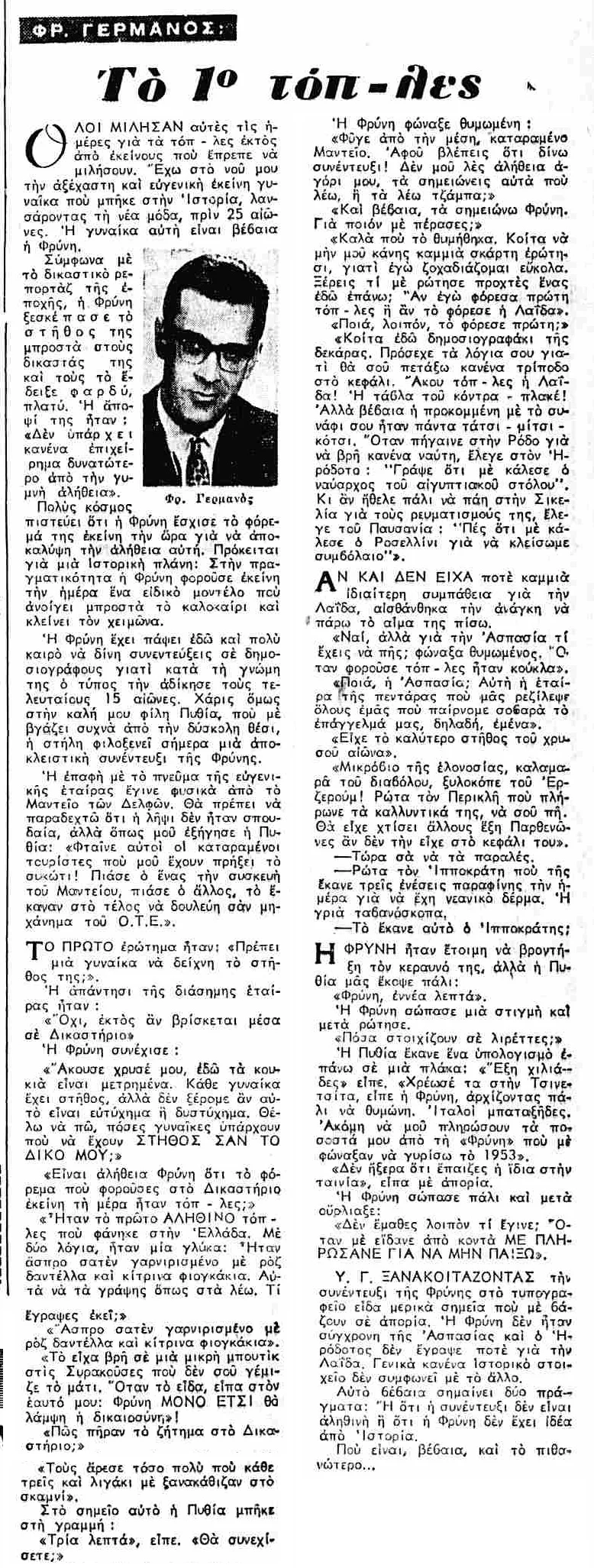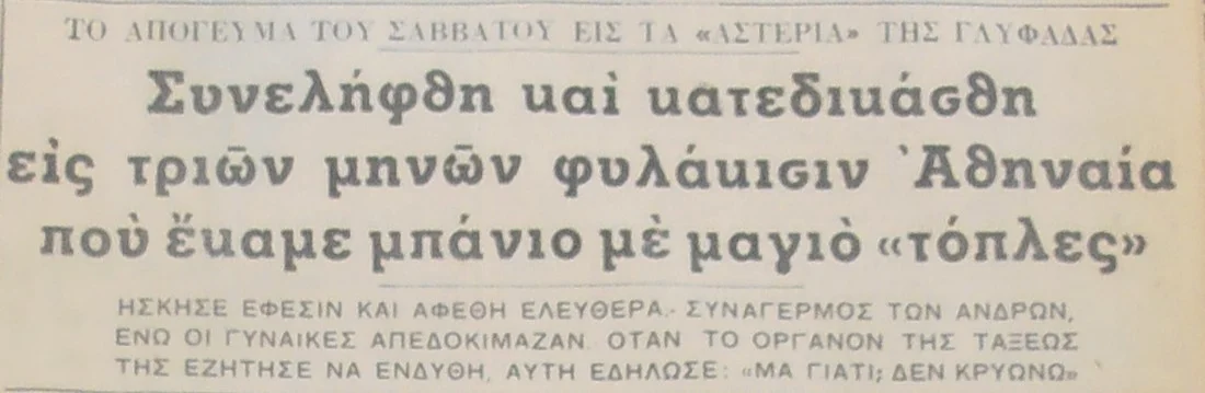 Όπως διαβάζουμε στις εφημερίδες της εποχής η νεαρή Αθηναία ήταν στριπτιζέζ με το όνομα Θέμιδα. Οδηγήθηκε στο Τμήμα Χωροφυλακής Γλυφάδας όπου ο αξιωματικός υπηρεσίας Π. Καρμπής την παρέπεμψε στο αυτόφωρο.