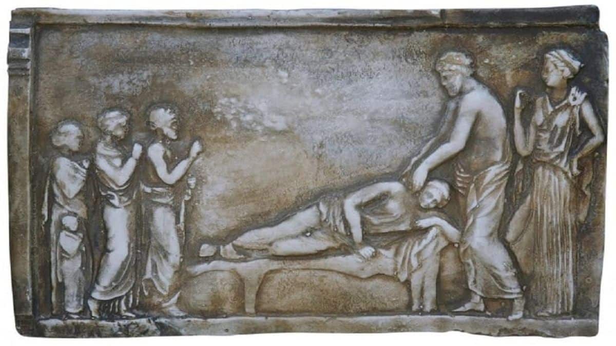 Όταν ο Μενέλαος τραυματίσθηκε στον Τρωϊκό πόλεμο τον εξέτασε ο ιατρός Μαχάων, «άνδρας ίσος με τους θεούς «ισόθεος», προσπάθησε το βέλος να τραβήξει… κι’ αφού εξέτασε την πληγή, εκεί που μέσα έφτασε το βέλος το φαρμακερό, το αίμα βύζαξε, δίχως χρονοτριβή και με πείρα πασπάλισε «ήπια φάρμακα» φάρμακα μαλακτικά, που κάποτε τα χάρισε στον πατέρα του, τον Ασκληπιό, ο Χείρων», (Ιλ. Δ 212-218).