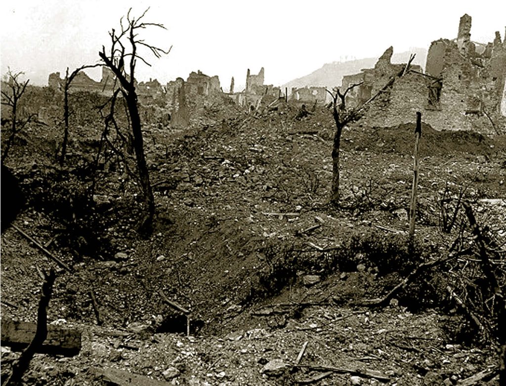 Εντός τριών ωρών όλα είχαν γίνει στάχτη. Εγράφη ότι ποτέ άλλοτε δεν έπεσαν τόσες πολλές βόμβες σε ένα συγκεκριμένο, γεωγραφικώς περιορισμένο, σημείο! Μόνον η υπόγεια κρύπτη γλίτωσε την καταστροφή.