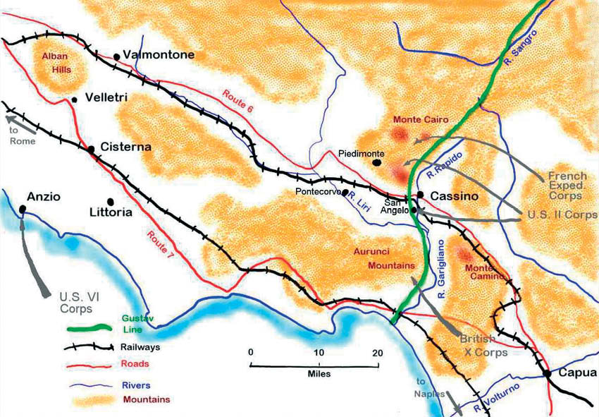 Κατά μήκος της αγγλοαμερικανικής γραμμής προελάσεως κυλούσε ο χείμαρρος Ράπιντο, ο οποίος πήγαζε από τα κεντρικά Απέννινα, την κραταιά οροσειρά της Ιταλίας, διερχόταν από το Κασίνο και έφθανε στην κοιλάδα, εκεί όπου ο ποταμός Λίρι ενώνεται με τον Ράπιντο και συνεχίζει ονομαζόμενος Γκαριλιάνο.