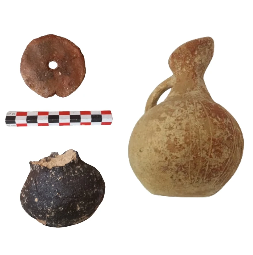 Βρέθηκαν πολλά θραύσματα μεγάλων πίθων με ανάγλυφη διακόσμηση του τύπου «μετοπών – τριγλύφων», αλλά και με κυματοειδείς ταινίες, θραύσματα εμπορικών αμφορέων, μελαμβαφής κεραμική του 6ου και 5ου αιώνα π.Χ., και αρκετές πήλινες πυραμιδόσχημες αγνύθες (Εικ.12). Ιδιαίτερο ενδιαφέρον παρουσιάζει μαρμάρινο αντικείμενο, πιθανόν ναύδετο.