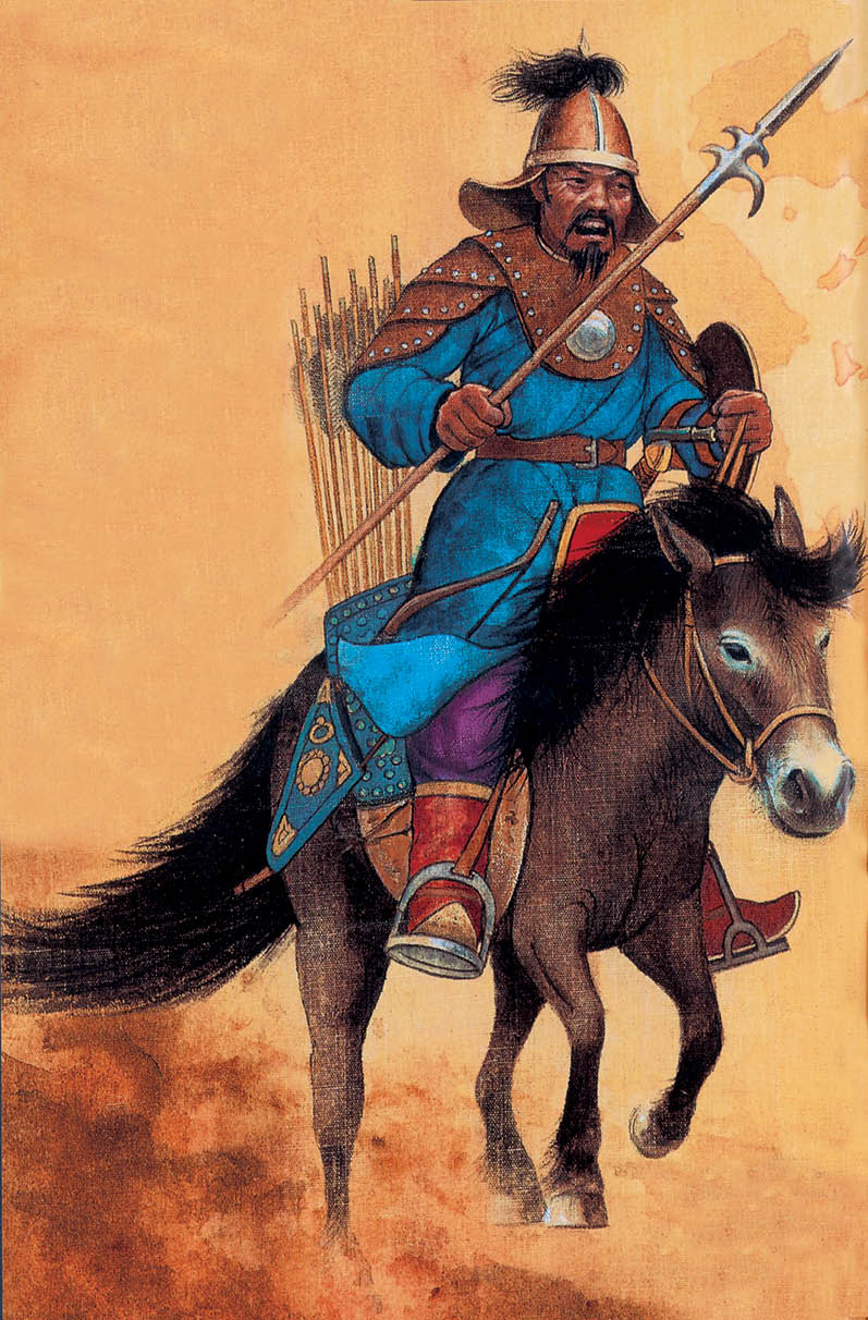 Ο Μογγόλος ιππέας φορούσε κράνος από δέρμα και έφερε θώρακα από δέρμα αλόγου που είχε σκληρυνθεί με αλογίσια ούρα, κάτω δε από τον μανδύα του φορούσε ένα χοντρό χιτώνιο από μετάξι, το οποίο επιβράδυνε τη διείσδυση του βέλους στη σάρκα του.