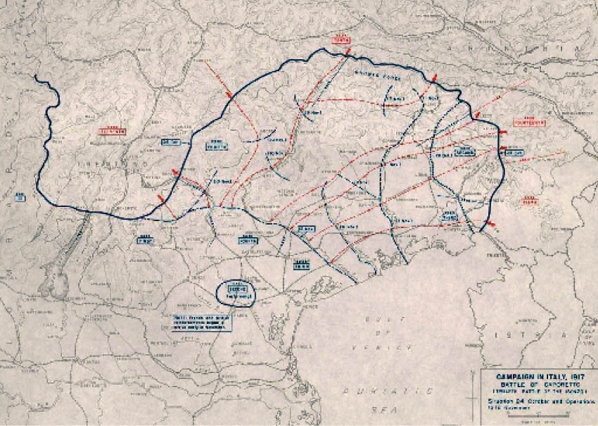 Όταν όμως έφτασαν στα πρώτα ιταλικά χαρακώματα, βρήκαν μόνο μια σειρά από λάκκους, ανασκαμμένους από τις οβίδες του βαρέος πυροβολικού, και μερικές τρεμάμενες ανθρώπινες φιγούρες με τα χέρια ψηλά.