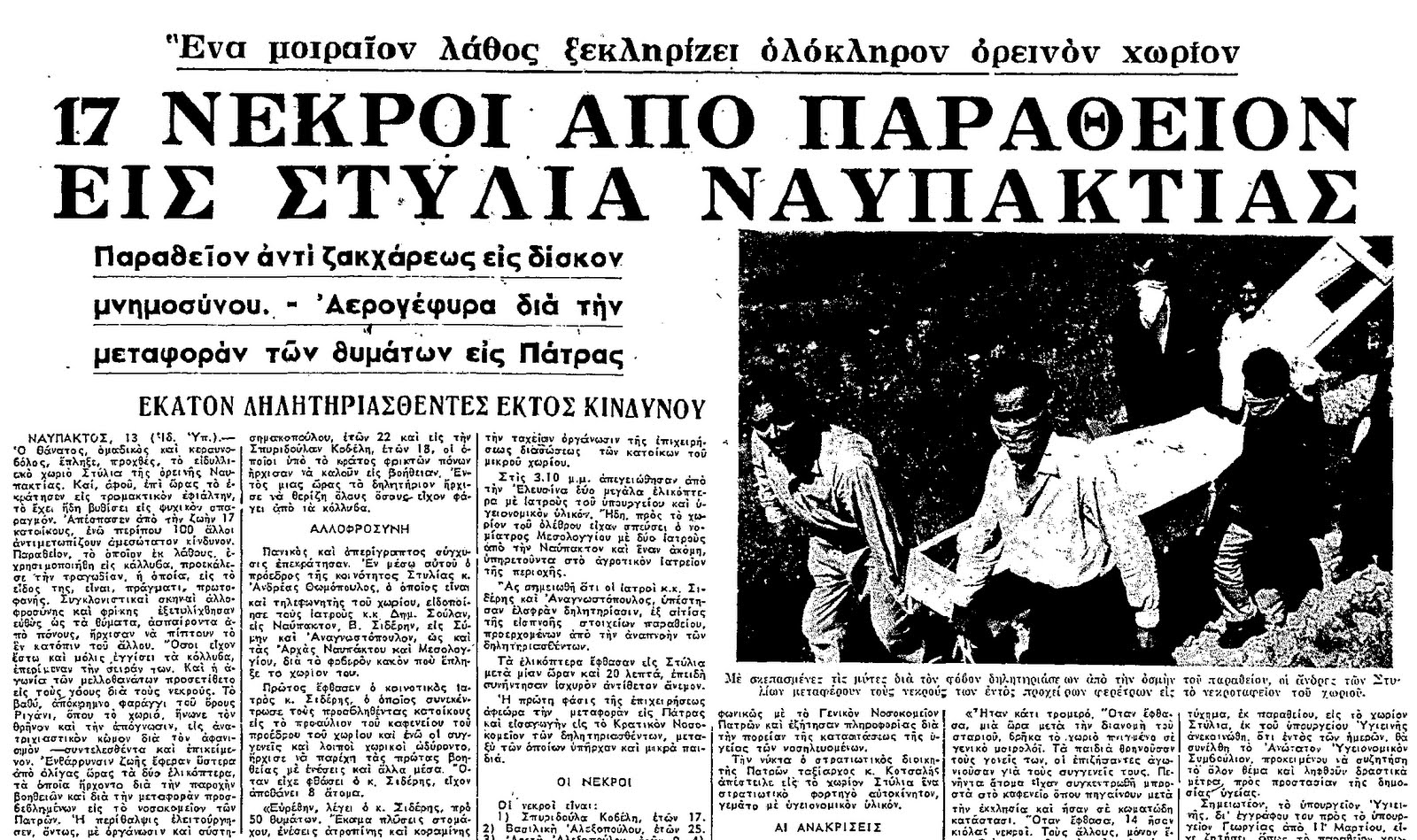 Σαν σήμερα 13 Ιουλίου του 1964, σημειώθηκε μια πρωτοφανής τραγωδία στο χωριό Στυλία της ορεινής Ναυπακτίας, καθώς ένα μνημόσυνο εξελίχθηκε σε εφιάλτη με 17 ανθρώπους να βρίσκουν τραγικό θάνατο έπειτα από κατάποση παραθείου που περιείχαν τα κόλλυβα.