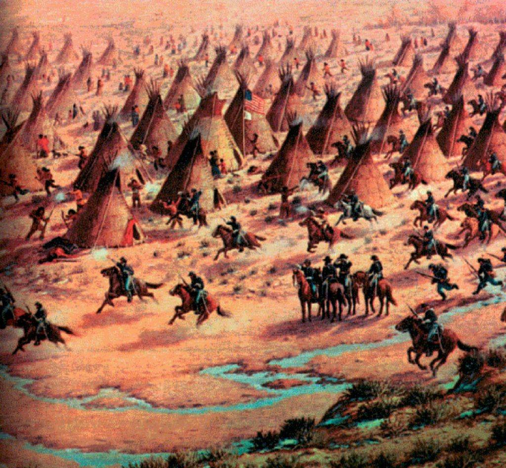 Οι Ινδιάνοι αιφνιδιάστηκαν πλήρως. Αλλόφρονες πήραν τα όπλα και επιχείρησαν να υπερασπιστούν τους εαυτούς τους. Μέσα στο χάος, ακούγονταν τα κλάματα των παιδιών και οι κραυγές και οι κατάρες των γυναικών. Τα πυροβόλα άρχισαν να βάλλουν, τινάζοντας στον αέρα σκηνές, άλογα, ανθρώπους.