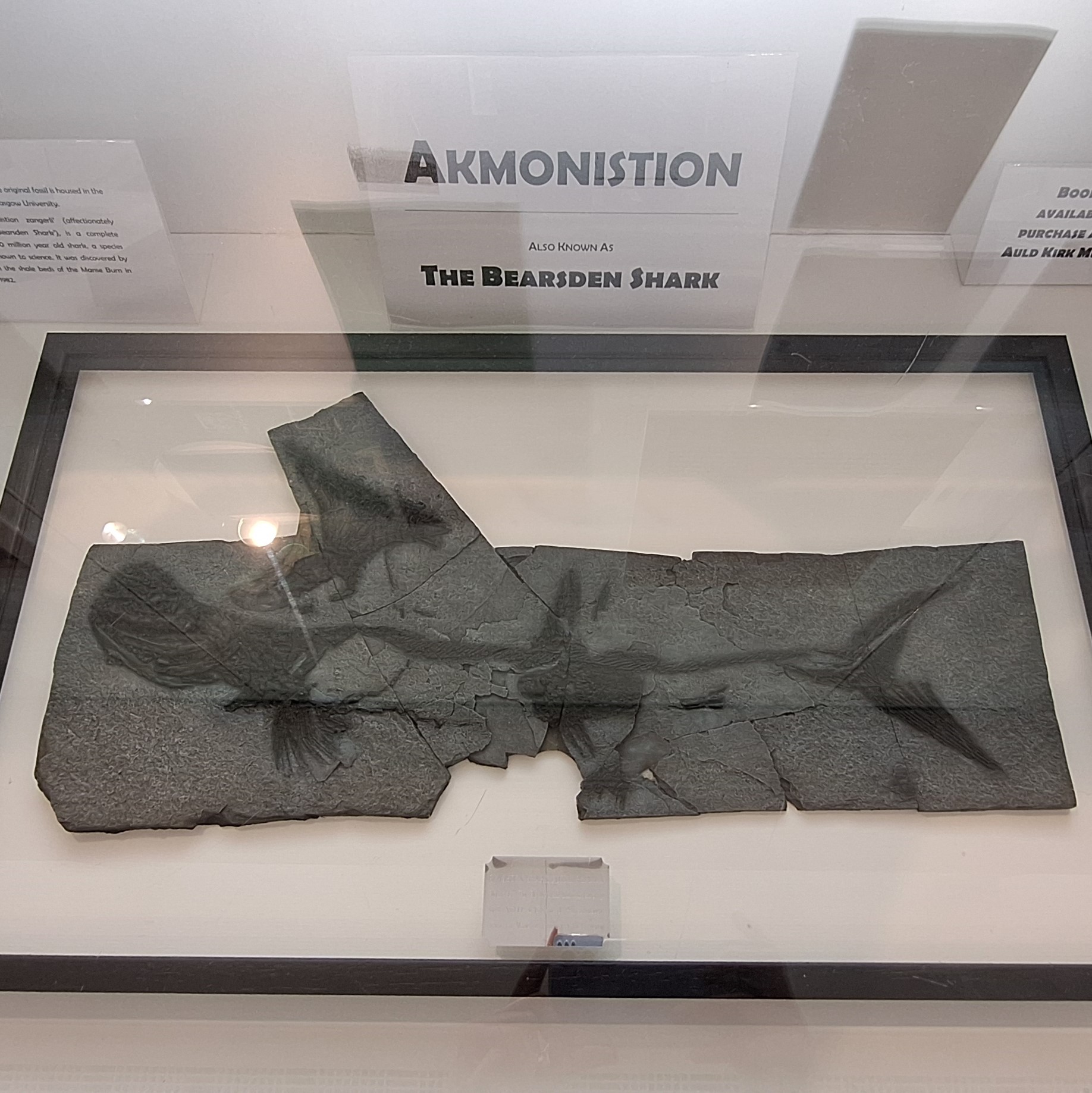 Currently on loan and on display in the foyer of the Kirkintilloch Library is a cast of the Bearsden Shark. The fossil, ‘Akmonistion zangerli’, is a complete skeleton of a 330 million year old shark that was discovered in Bearsden in 1982. #shark #fossil #localhistory pic.twitter.com/253KtzrkHG