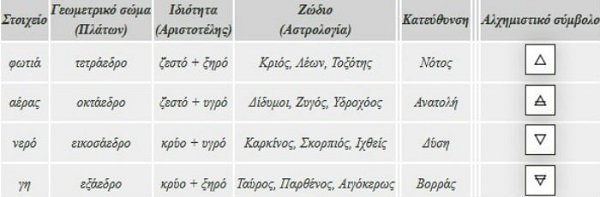 Επίσης η θεωρία των τεσσάρων στοιχείων θεσπίστηκε και από τους αστρολόγους, οι οποίοι κατέταξαν τα ζώδια σύμφωνα με τα τέσσερα στοιχεία. Συνολικά έχουμε λοιπόν τις εξής σχέσεις μεταξύ των τεσσάρων στοιχείων και των διαφόρων: